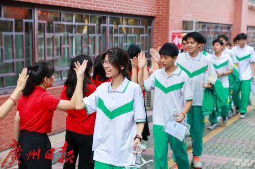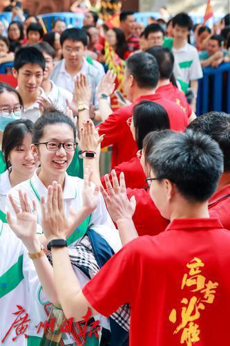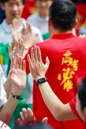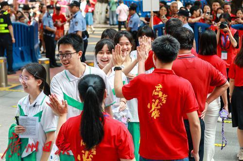 2025年6月7日,高考第一天,考生和家长和老师击掌鼓劲后自信步入南武中学考场,开始一连三天的高考。