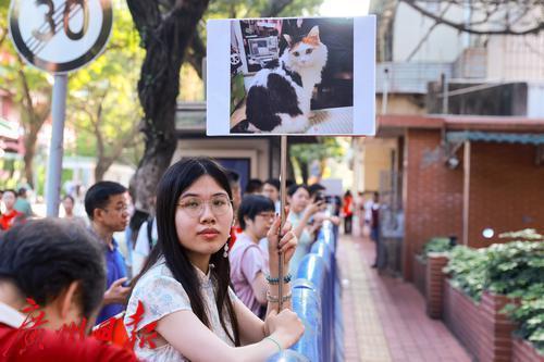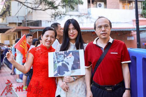 姐姐举着爸爸自制的爱猫牌,妈妈穿着红旗袍,带着爸爸来到南武中学考场门口支持妹妹。姐姐说,妹妹很爱小猫“曲奇”,但是小猫怕人带不过来,所以爸爸特意做了个猫牌来支持妹妹。