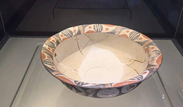 这件白衣彩陶盆并非完整无缺,器身有先民修补的痕迹。在盆身裂缝旁,先民们钻出一些两两相对的小孔,并用金属将之补齐,这和数千年后才出现的锔工艺较为类似。