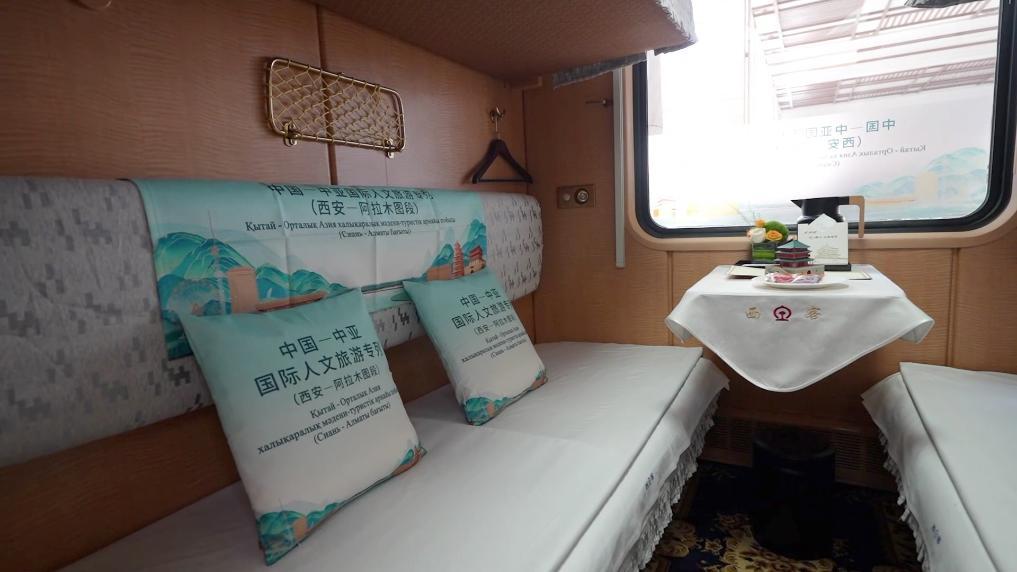 专列车身采用“丝路金桥”主题涂装,车内装饰融入大雁塔、古城墙、钟楼等西安地标以及哈萨克斯坦地标性建筑等元素。此外,专列上的文化活动也格外丰富。车厢内每日安排中医养生、手工制作、书画创作等文化交流活动,沿途还开展了合唱、民乐演奏等文化展演,让列车成为“流动的文化交流长廊”。