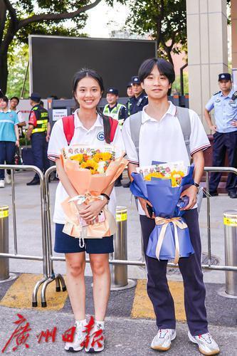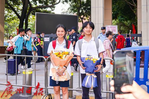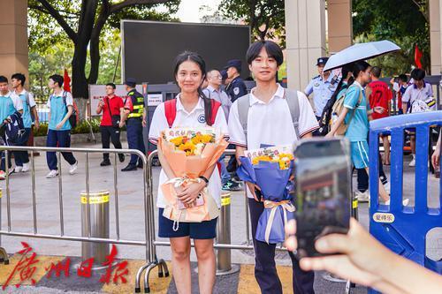 考生拿着家长送的鲜花在考点合影留念。