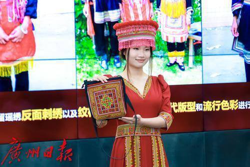 广东外语外贸大学瑶篮瑶绣实践团成员展示改良瑶绣服饰。