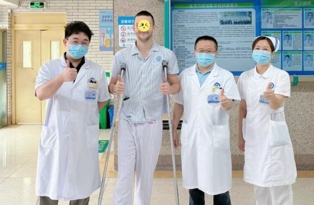 术后第一天,山姆惊喜地发现,右踝不仅没有明显不适,关节被动屈伸也十分顺畅;第二天,在康复医生的专业指导下,他已能佩戴支具、拄拐尝试下地锻炼;第三天,经检查伤口愈合良好,完成换药处理后便顺利出院。