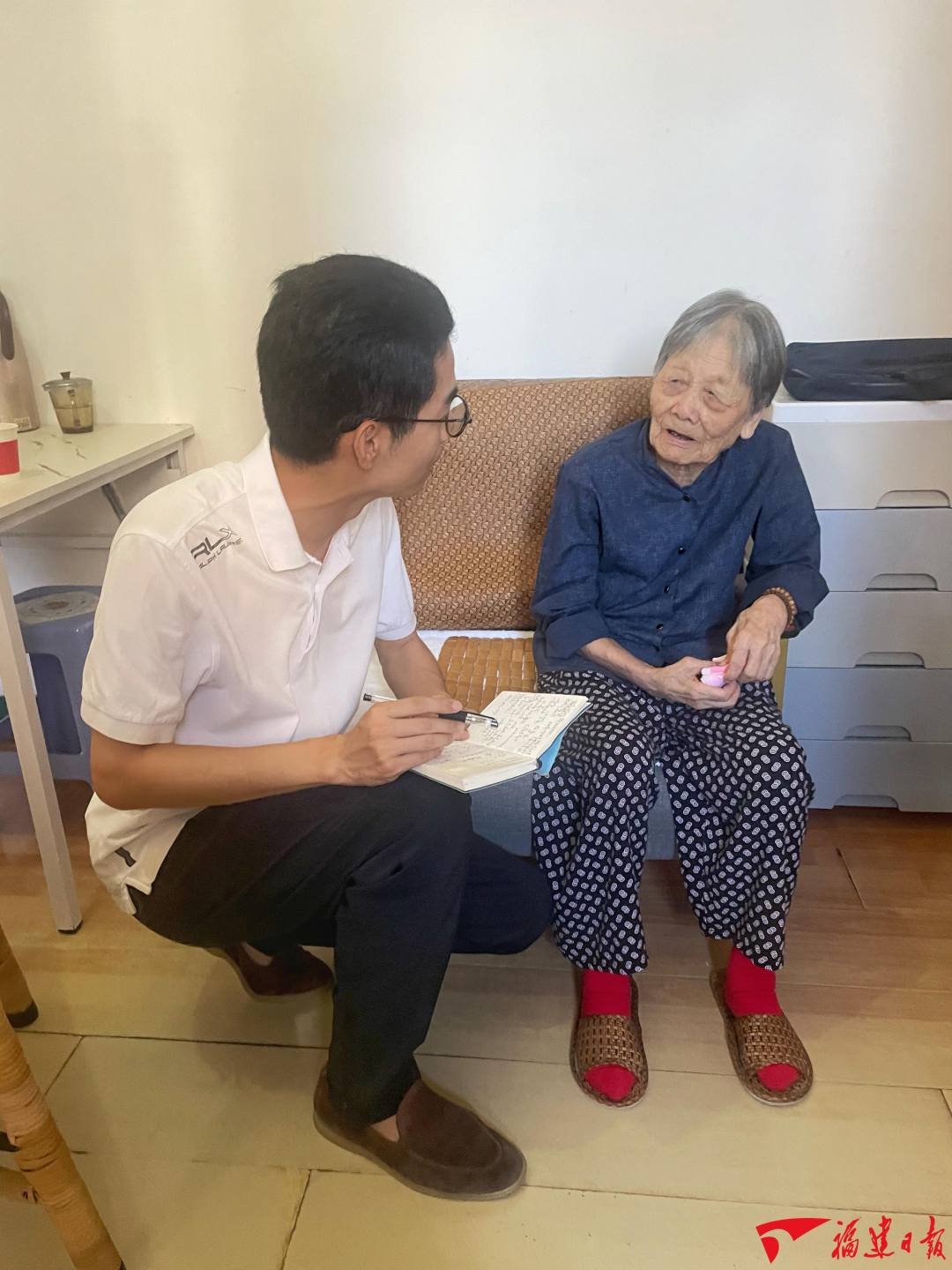 记者采访台湾义勇队少年团原团员张秀卿老人。