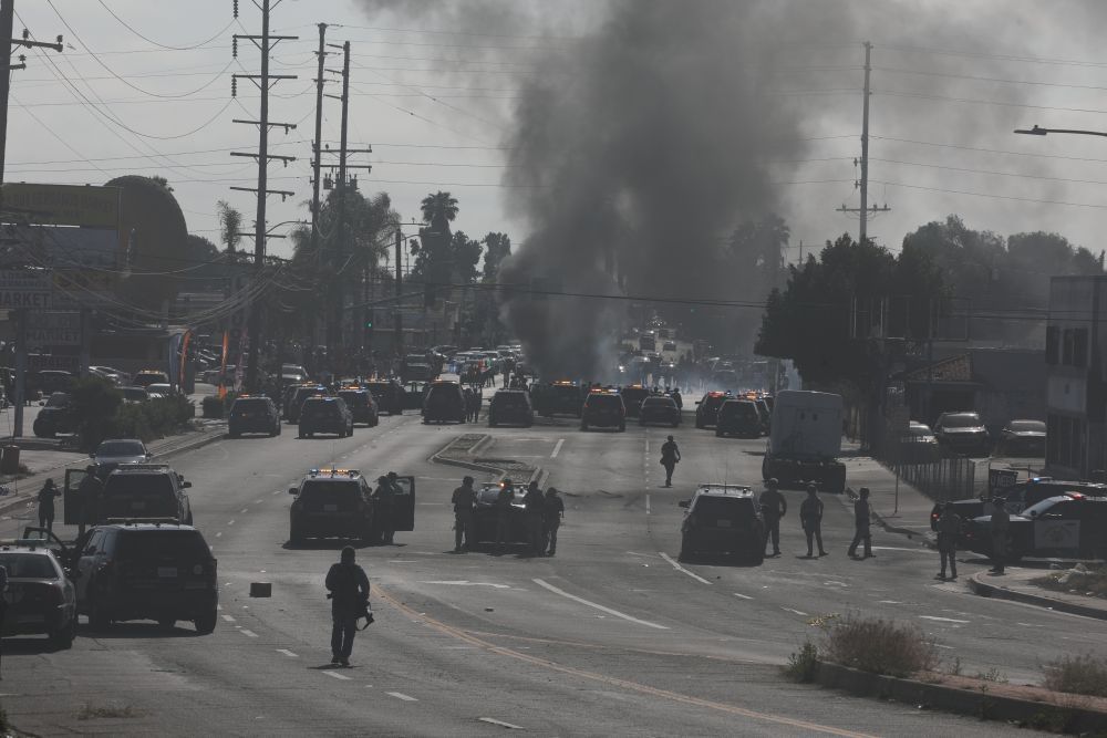 6月7日,在美国加州洛杉矶县,示威民众与警方对峙现场冒出浓烟。新华社发(邱晨摄)