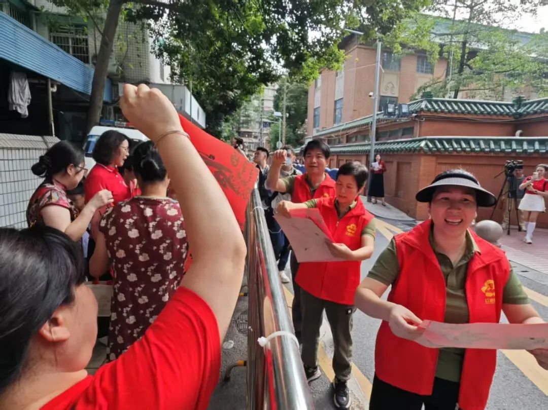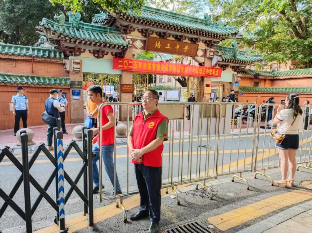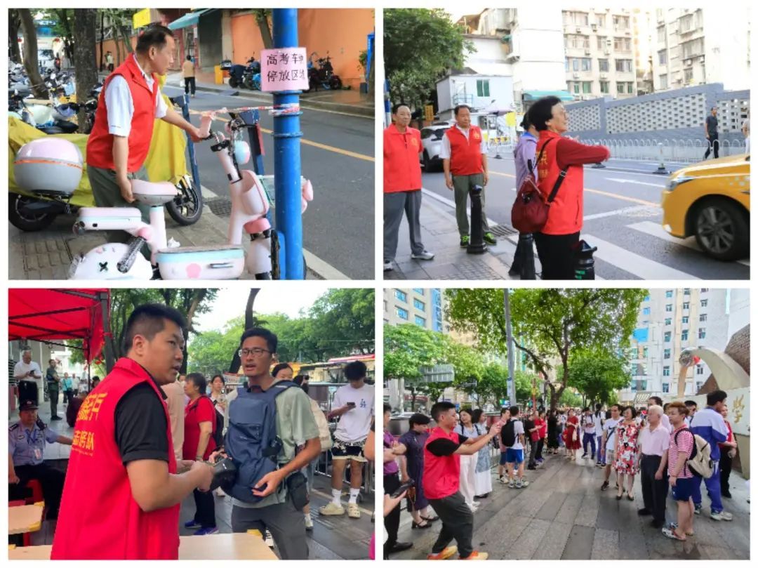 在各个考点周边,“红棉老兵”化身“流动哨兵”,成为交通疏导的中坚力量。在培正中学、铁一中学等考点周边关键路口协同交警疏导人流车流。他们手持指挥旗,引导送考车辆“即停即走”,劝阻违规停车、鸣笛等行为,并开辟“考生绿色通道”,确保步行考生优先通行。针对考点周边易堵路段,提前规划应急绕行路线,对突发交通事故进行快速疏导,有效缓解了考点周边交通压力。