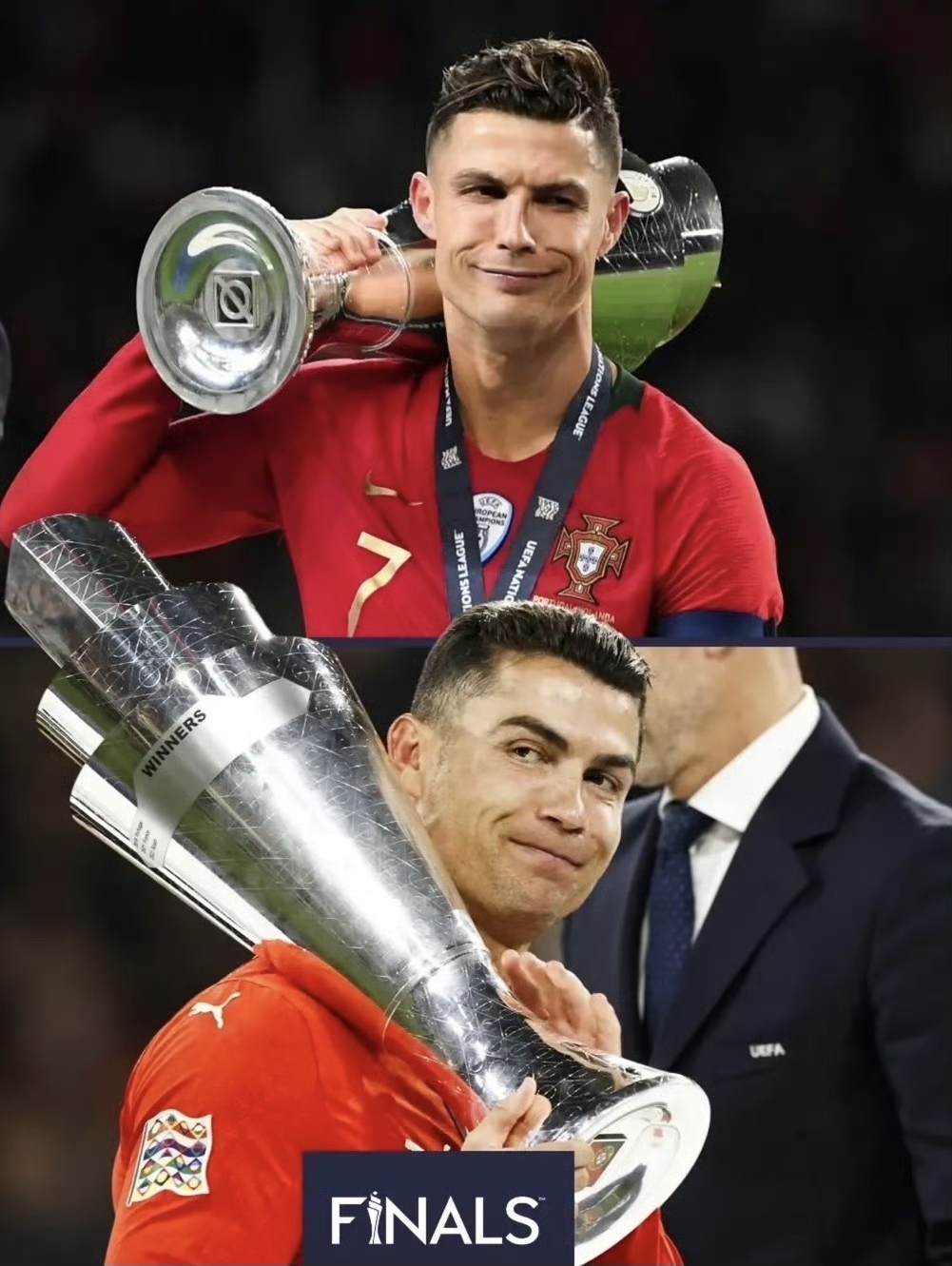 C罗在破门之后被换下场,2016年欧洲杯夺冠那次,他也是在决赛中因伤提前下场的。点球大战,C罗都不敢看,听到欢呼后才双腿跪地振臂怒吼庆祝,随后更掩面而泣。赛后,葡萄牙的队员将他团团围住,拍着他的头庆祝。原来C罗在热身时已经感到腿部不适了:“为了国家队,即使要断腿我也愿意。这是一个冠军,我必须上场,我尽了全力,坚持到了最后一刻,还打进了一球。”对于落泪,C罗则表示:“那是喜悦的泪水,为葡萄牙队赢得胜利总是特别的,我已经赢得了许多个人荣誉,但没有什么能比为国家队赢得比赛更令人激动。我非常渴望这次胜利,我们也配得上这场胜利,这将给我们带来信心,相信明年世界杯,葡萄牙队可以和任何强队竞争。我们一直有着远大的抱负,作为这支球队的队长,我感到非常自豪。”