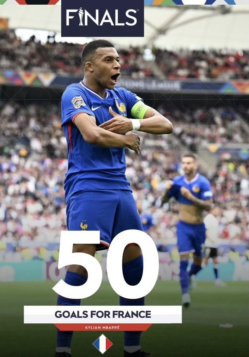 在稍前进行的季军战,姆巴佩传射建功,奥利塞破门,帮助法国队2比0战胜了东道主德国队获得本届欧国联的季军。姆巴佩继续朝着“法国第一射手”的目标前进,他在国家队90次出场已经打进50球。此外,葡萄牙队在半决赛时淘汰了本届欧国联决赛圈的东道主德国队,自1988年欧洲杯以来,凡是在德国举办的比赛当中淘汰德国队的球队都成为了最终的冠军。