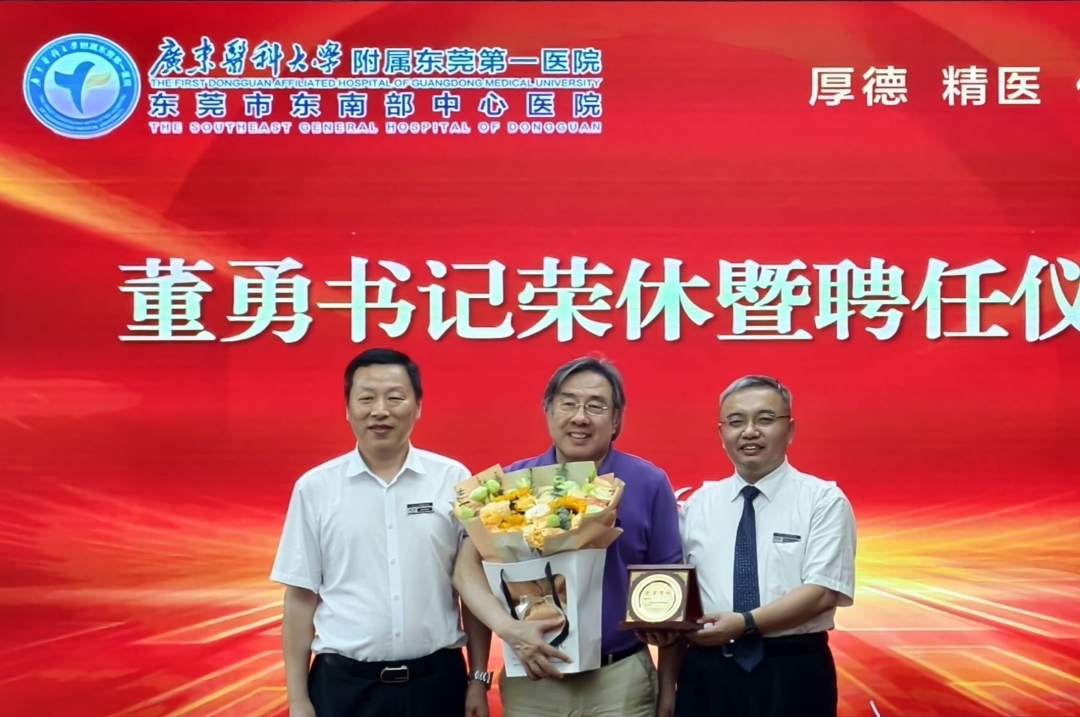 6月6日,东莞市东南部中心医院(广东医科大学附属东莞第一医院)为董勇举行荣休暨聘任仪式,医院领导班子和中层干部、行政部门负责人等会聚一堂,向他表达最由衷的感激、最诚挚的祝福。