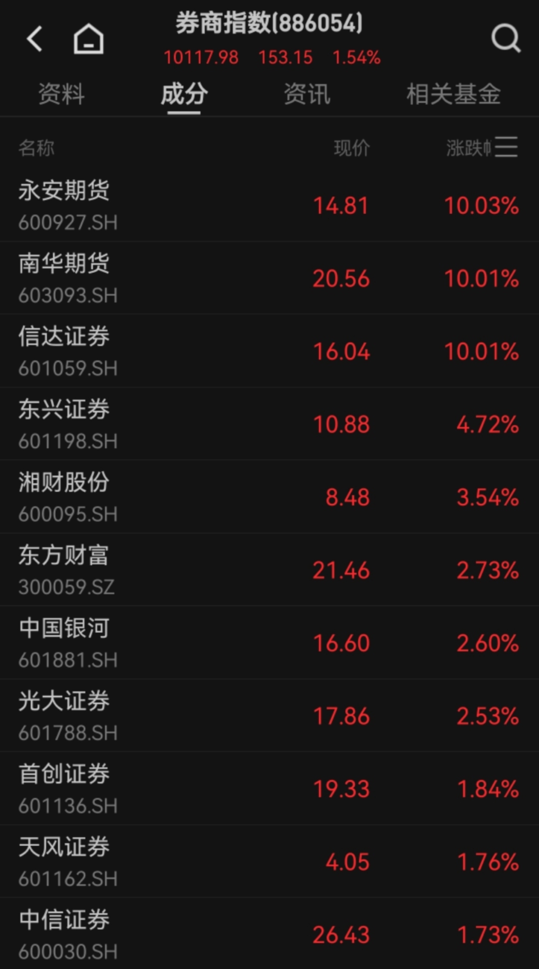在金融板块,互联网金融题材走强,旗天科技涨逾16%,楚天龙、东信和平、中嘉博创、恒宝股份涨停。券商股表现同样亮眼,永安期货、南华期货、信达证券涨停,东兴证券涨近5%。