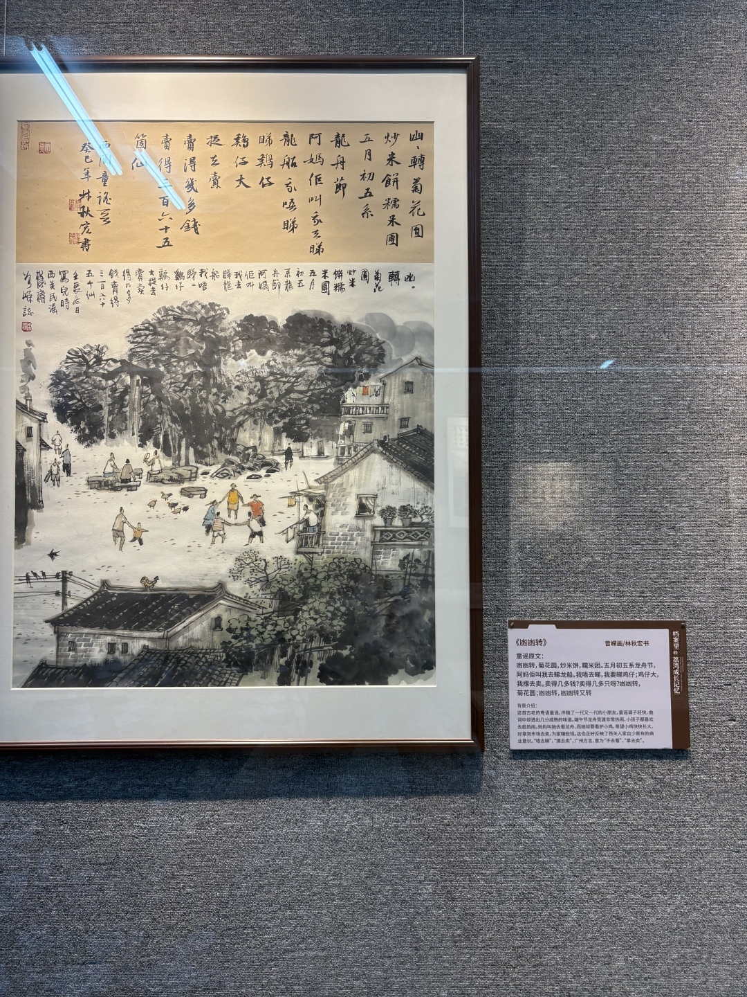 大榕树下、街巷边、池塘边、屋子里……孩子结伴玩耍、与长辈互动,打水花、点虫虫、捉蜻蜓、转圈圈、骑牛牛……童趣与温馨溢出水墨画面。此次文化展由荔湾区档案部门精心策划推出,展览以档案部门长期收集、整理的珍贵广府童谣档案为核心内容,精选《月光光》《落雨大》《凼凼转》等22首承载着浓厚广府风情和集体记忆的粤语童谣艺术档案,通过对口述档案资源的深度挖掘,转化为鲜活的场景画面,设置“荔湾记忆”“家庭日常”“游戏童年”“自然之约”四大主题单元,生动呈现了跨越时光的童年趣事,展现荔湾社会风貌与生活图景,触摸城市记忆的温度。