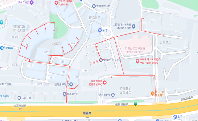 施工路段:越秀区恒福路93号大院、鸿福居、麓湖国际酒店、中国人民银行疗养院部分车行道、人行道,全长约1309米。