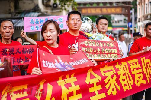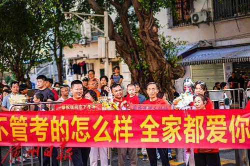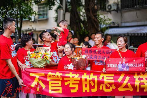 在现场,记者还看到了一家人,男女老少一共出动了14人,举着牌子、拉着“不管考得怎么样,全家都爱你”的横幅来迎接考生。