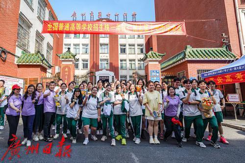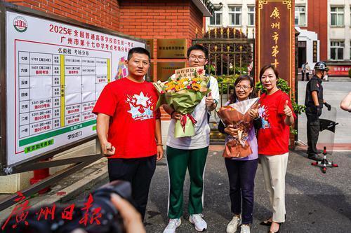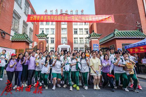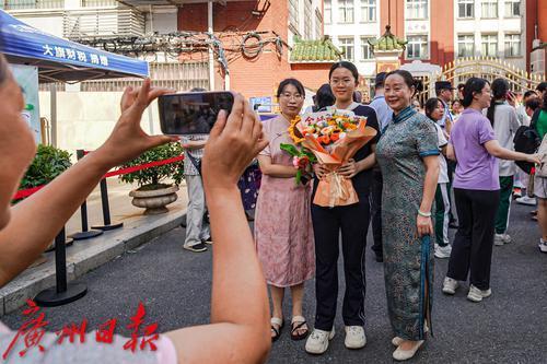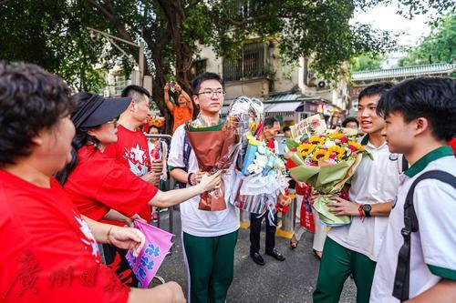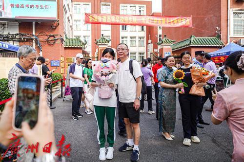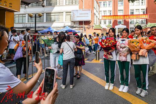 在校门外,早已是等候多时的家长,家长们给考生递上鲜花,祝贺孩子们顺利完成高考。学校老师还组织考完的考生在校门口一起合影留念,现场氛围欢快,午后的高温也难抵青春的无限热情。