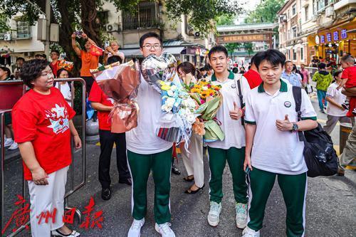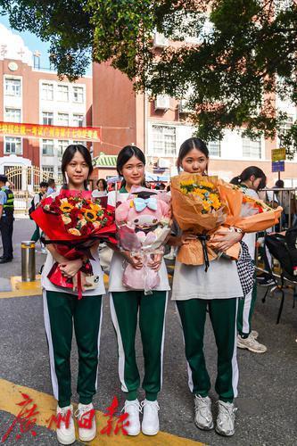 考完的考生和同学们拿着鲜花合影留念。人生中的重要时刻,值得记录。