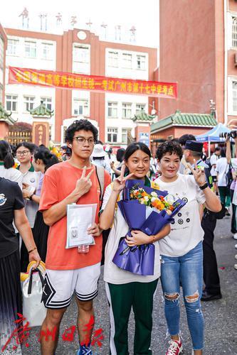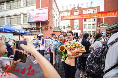 十七中考点门口,家长给走出考场的考生送上鲜花、玩偶,并合影留念。