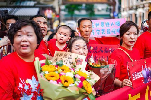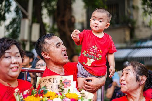 张向东的家人们穿红衣、拿鲜花、举牌子,等待他走出考场。