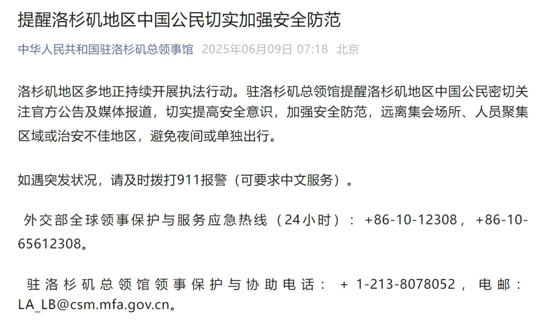 驻洛杉矶总领馆提醒:中国公民切实加强安全防范