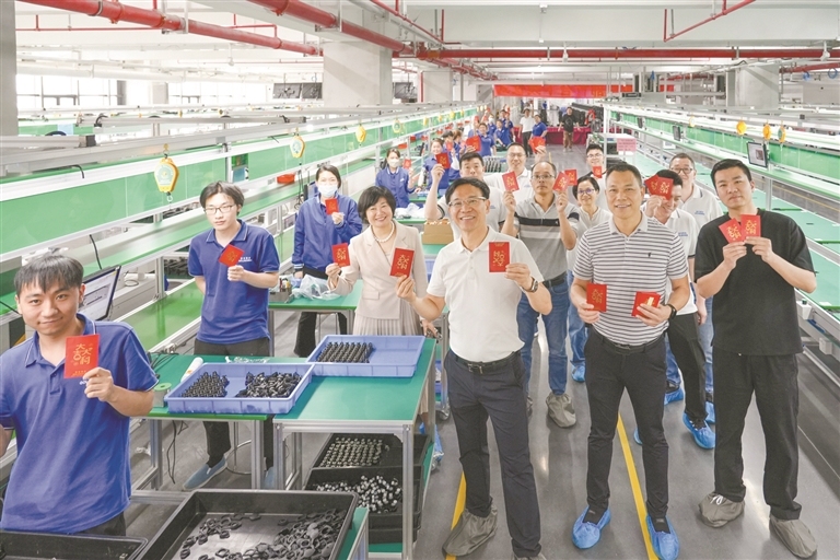 蒋伟楷夫妇参加浩洋股份新总部首台摇头灯的下线仪式。