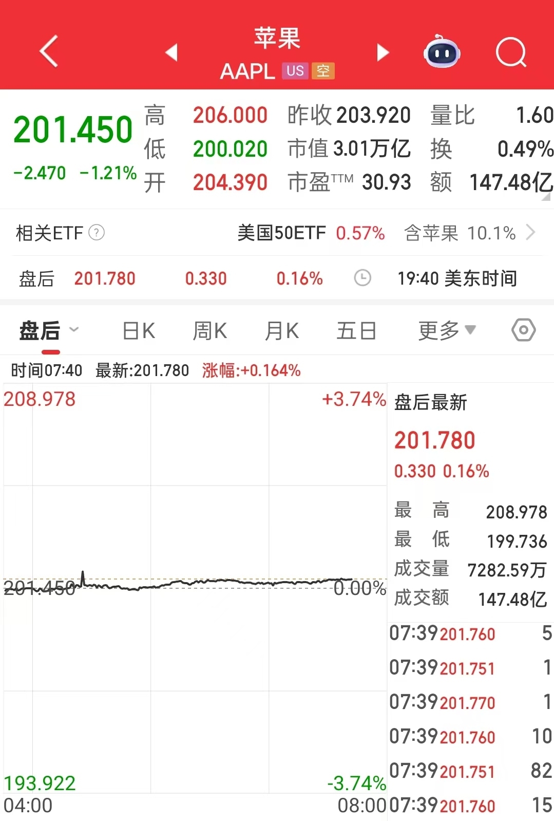 截至周一收盘,苹果股价下跌1.21%报201.45美元。