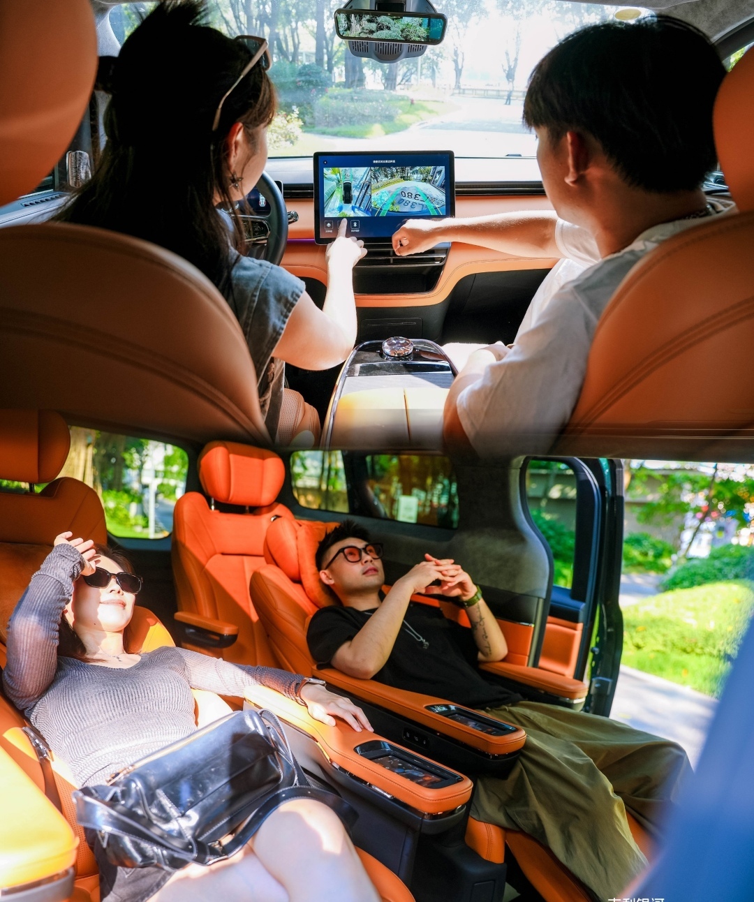 从具体车型来看,翼真L380以3100mm超长轴距构建实用三排座舱,打破传统旗舰车型“重二排轻三排”的局限。其中,第三排腿部空间达410mm,远超同级车型常规的350mm左右水平,配合航空座椅的8向电动调节、座椅加热及通风功能,即使身高180cm的乘客也能舒展落座。现场实测显示,三排头部空间均超过950mm,横向宽度达1520mm,配合1.5㎡全景天幕,车内无压迫感,阳光与视野兼得。