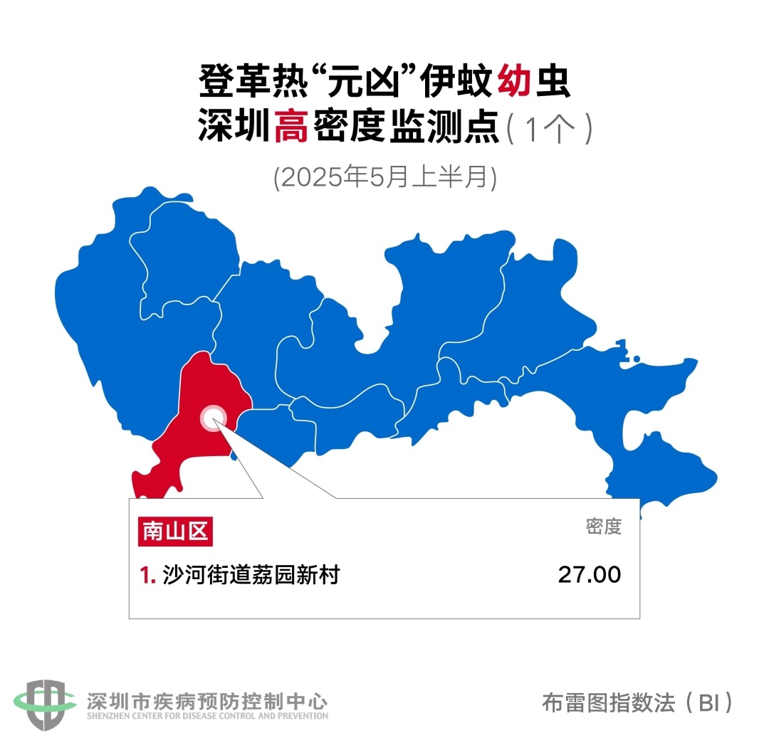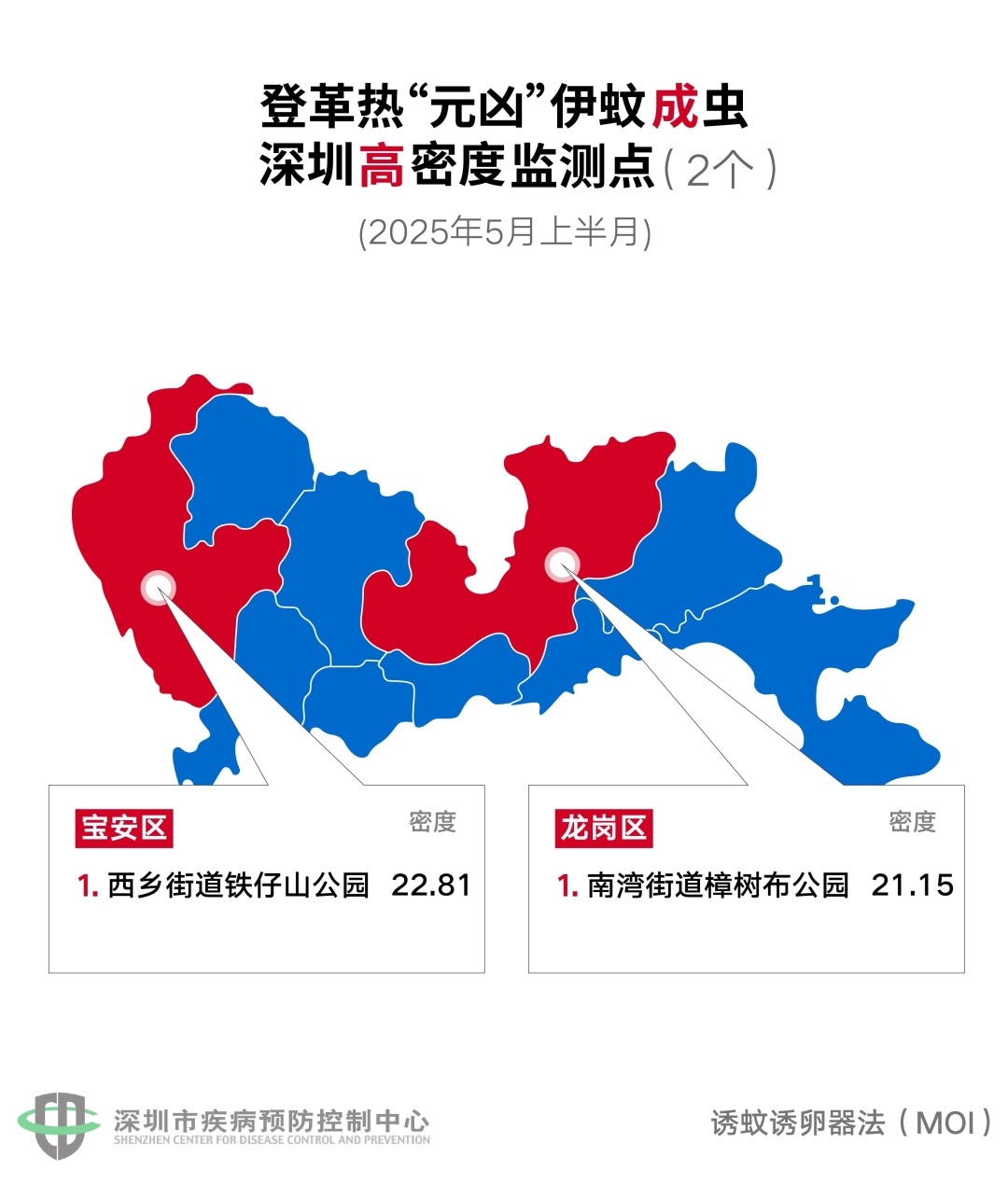深圳市疾控中心也发布了最新的伊蚊密度监测结果,提示近期蚊媒传染病传播风险增大。全市设置的442个监测点中,不合格的有195个,占了44.12%,其中高密度有3个,分别是南山区沙河街道荔园新村、宝安区西乡街道铁仔山公园和龙岗区南湾街道樟树布公园。