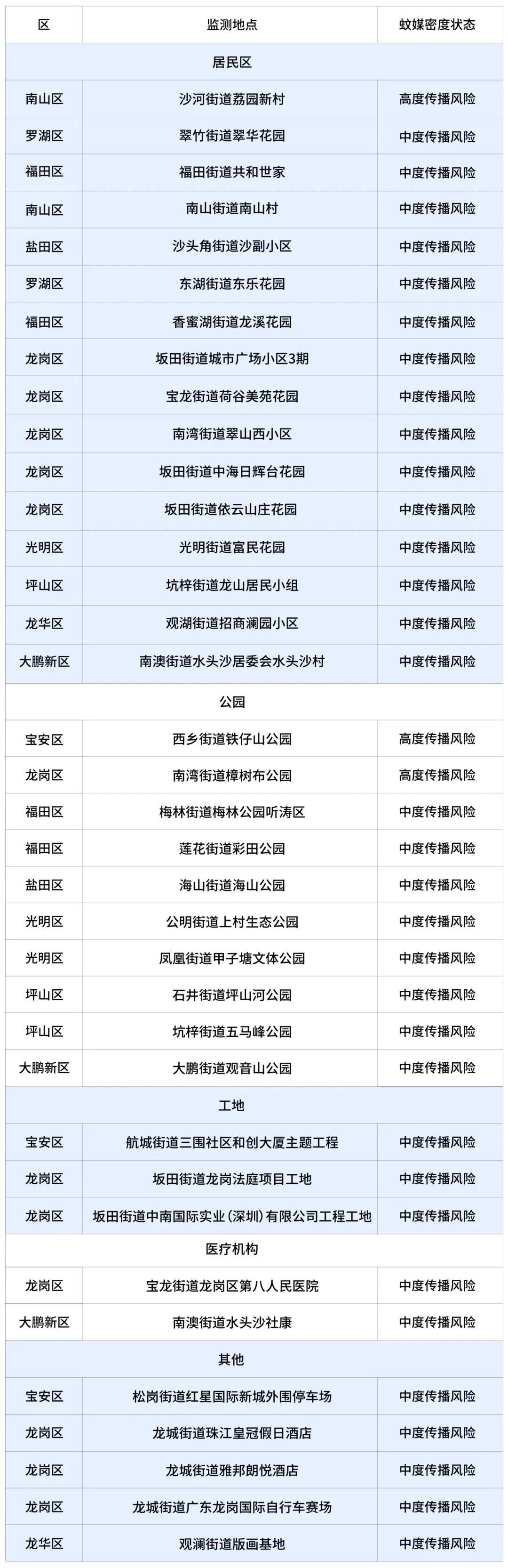 除3个高密度监测点外,深圳还发现了有一定传播风险的33个中密度点,龙岗区11个、福田区4个、大鹏新区3个、坪山区3个、光明区3个、罗湖区2个、盐田区2个、龙华区2个、南山区1个。