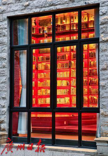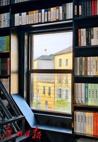 透过塔楼藏书区的窗户,馆内的书墙与馆外的欧式建筑相互交融。