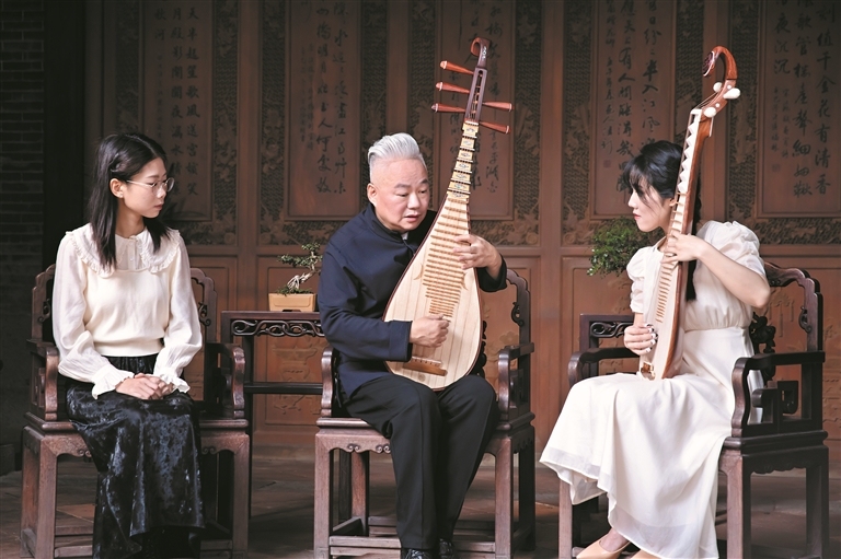 因为何博众,琵琶成为沙湾广东音乐的特色,而方锦龙本人也是当代五弦琵琶的代表人物。谈及用五弦琵琶演奏的原因,他拿起一旁自己的琵琶,边演示边介绍:“独奏的时候,四弦琵琶往往缺低音,而五弦多了条低音弦,效果就不一样了,声音更丰富一些。”他还认为,“五”这个数字很能体现中国文化,“我们吃饭讲‘五味俱全’,画画讲‘墨分五色’,音乐是‘五声音阶’。”