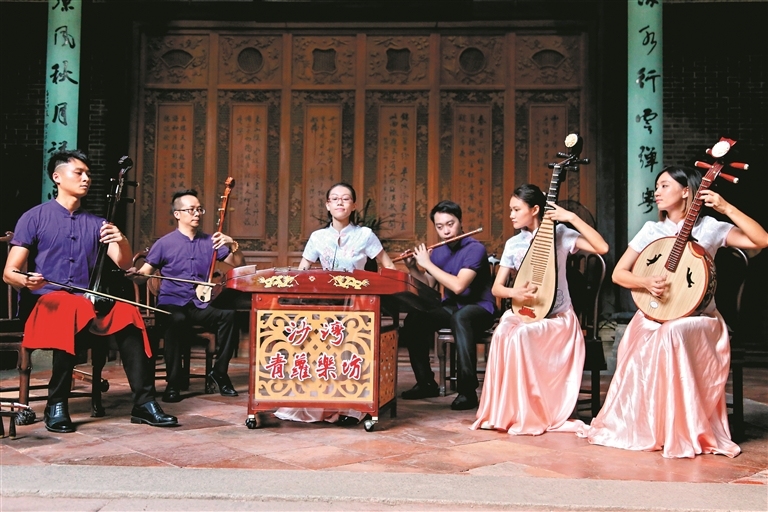 走在沙湾古镇,随处可闻从民居中飘出的音乐声。图为番禺沙湾青萝乐坊在三稔厅演奏广东音乐。