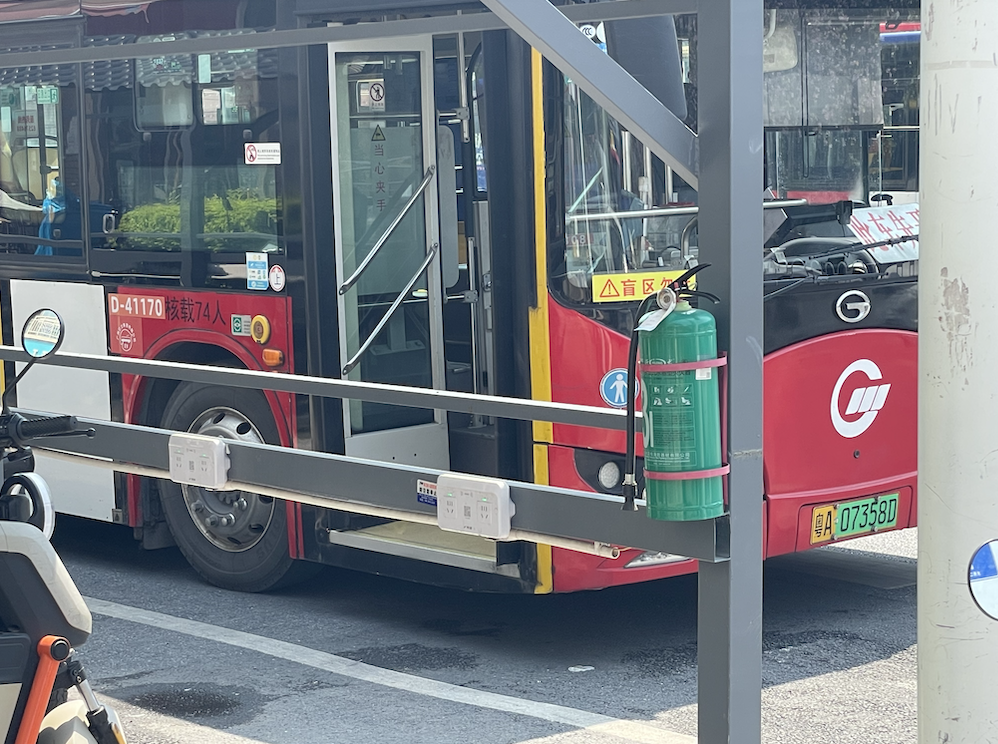 在隽龙湾小区邻靠水秀二路一侧,小e看到,不少电动自行车正有序停放在小区公共充电桩前,部分电动车正在充电中。这些充电桩点均设有雨棚,并配套灭火器等消防器材,两侧装有监控摄像头,充电桩上还贴有充电步骤指引及收费标准、温馨提示、安全告示等。
