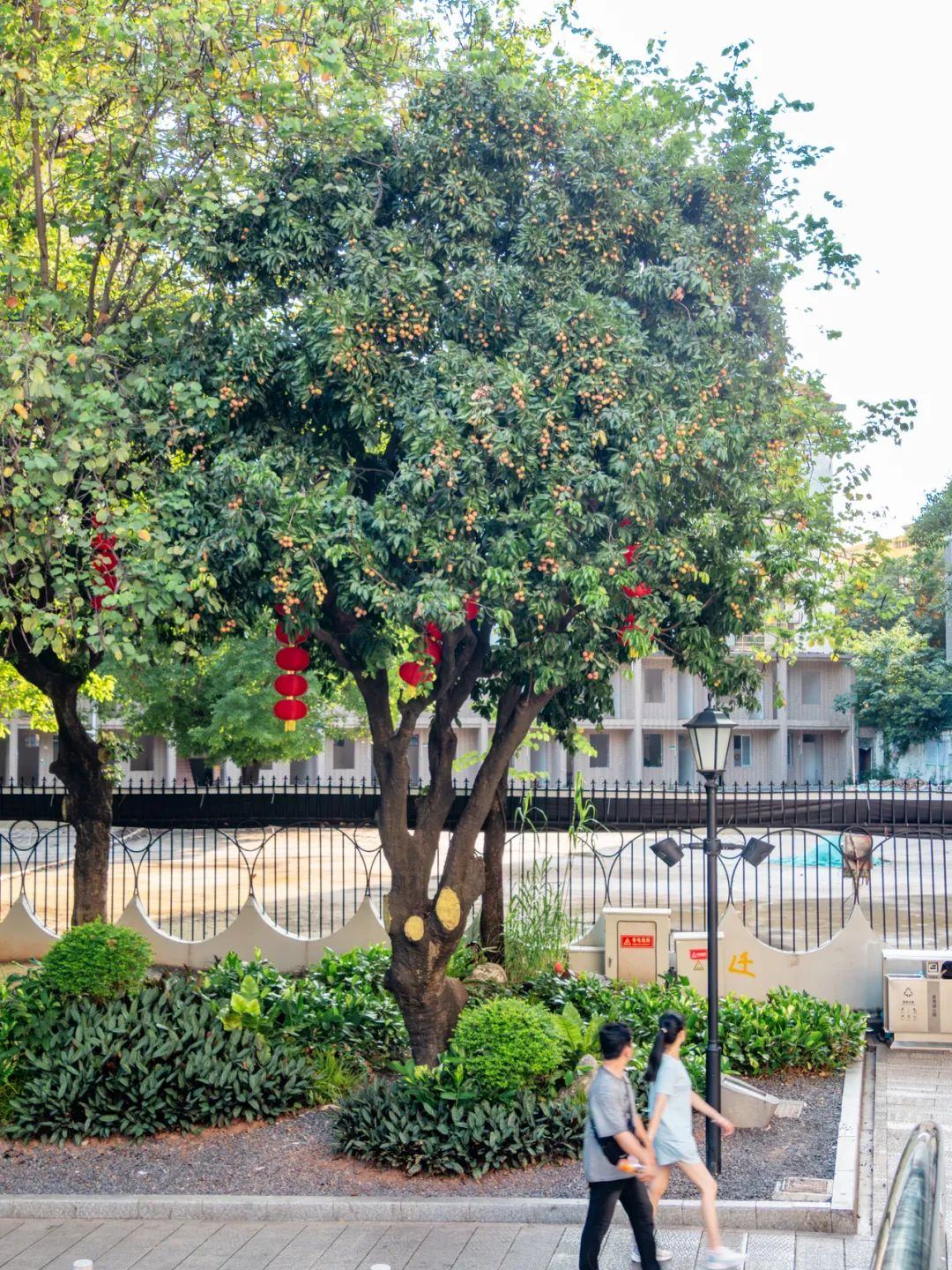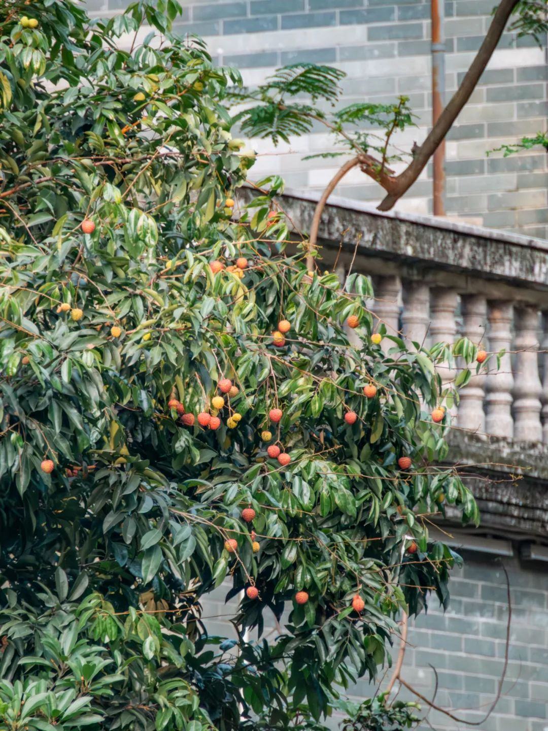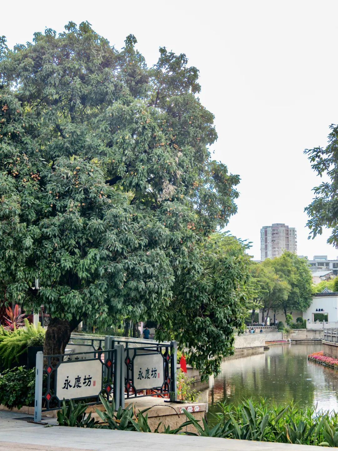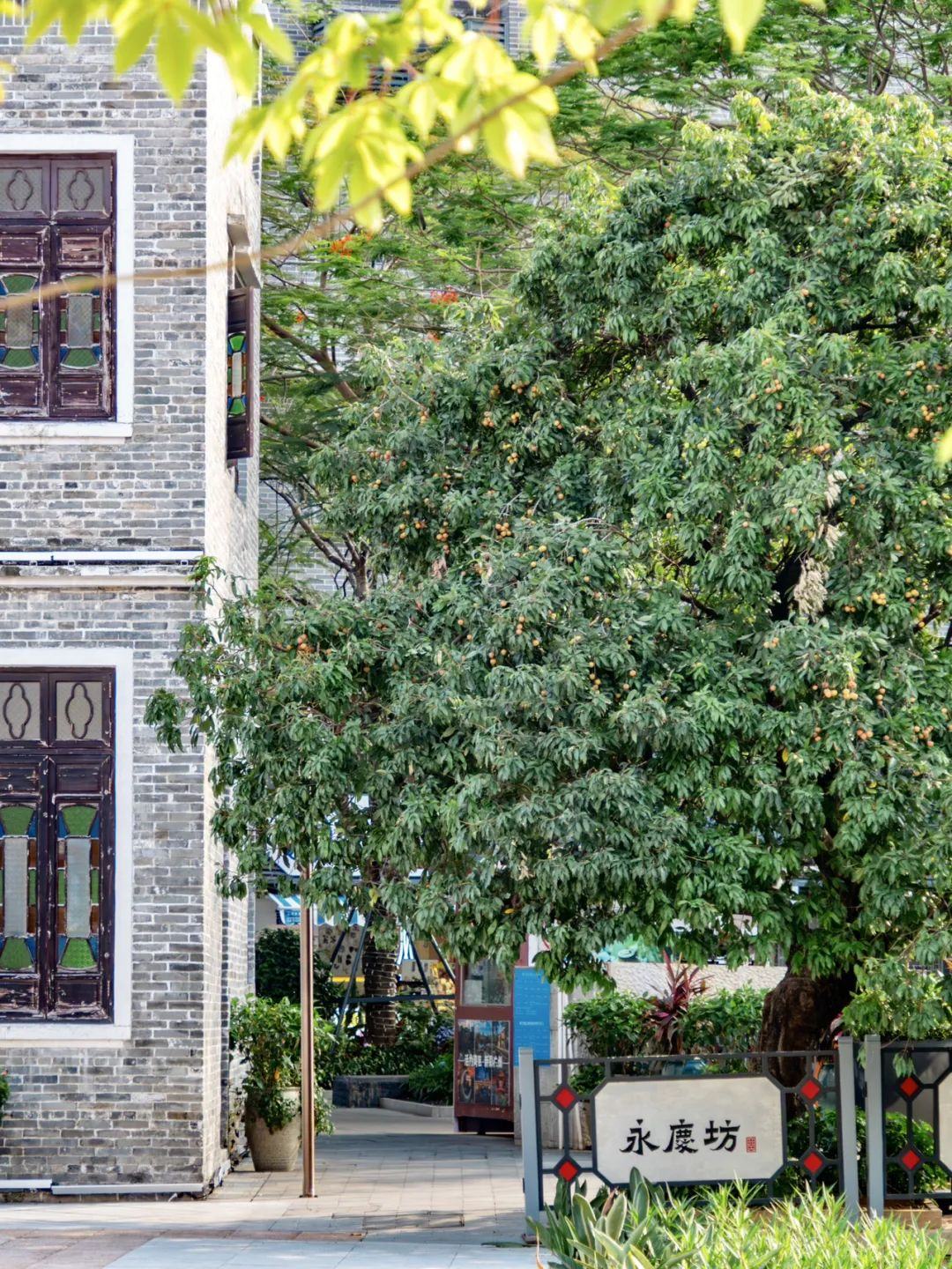 另外,在永庆坊“月亮桥”附近,树梢上已经成熟的荔枝果实,与粤剧艺术博物馆的建筑搭配成古香古色的美景。