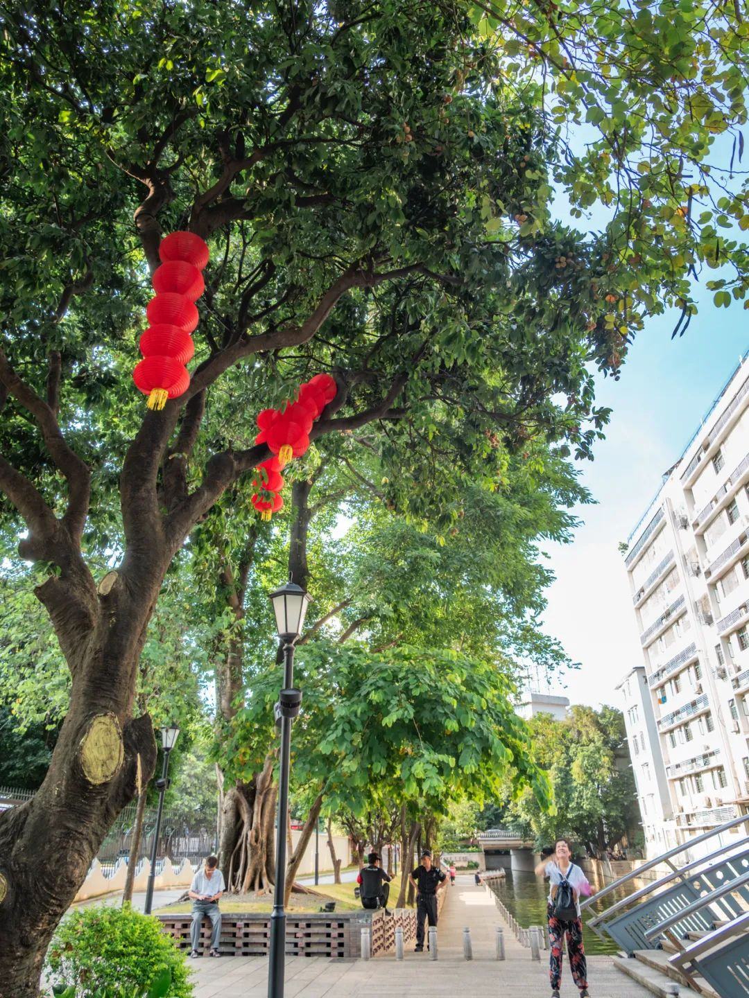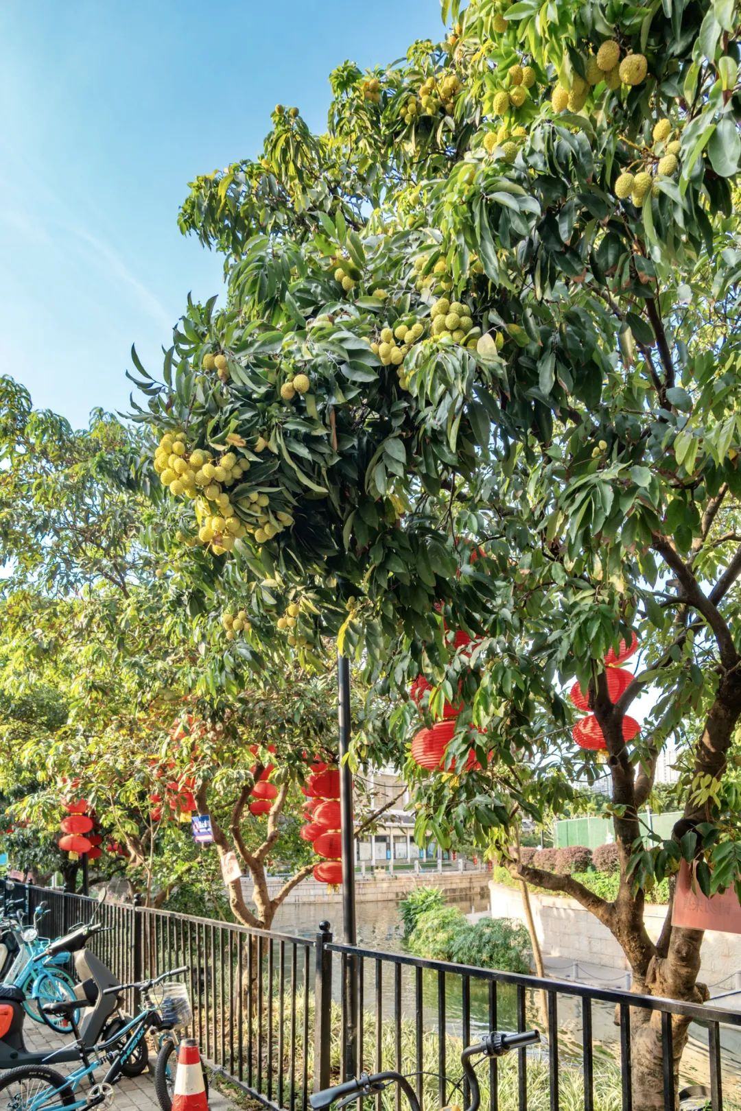 行至荔湾湖公园附近,可见鲜艳的荔果点缀着青绿的河岸,不停地吸引过往行人的目光。