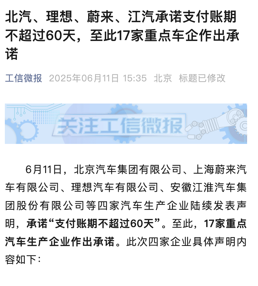 “工信微报”表示,此前,中国第一汽车集团有限公司、东风汽车集团有限公司、广州汽车集团股份有限公司、赛力斯集团股份有限公司、吉利汽车集团有限公司、重庆长安汽车股份有限公司、比亚迪汽车工业有限公司、奇瑞汽车股份有限公司、广东小鹏汽车科技集团有限公司、小米汽车有限公司、长城汽车股份有限公司、浙江零跑科技股份有限公司、上海汽车集团股份有限公司等13家汽车生产企业陆续发表声明,承诺“支付账款不超过60天”。