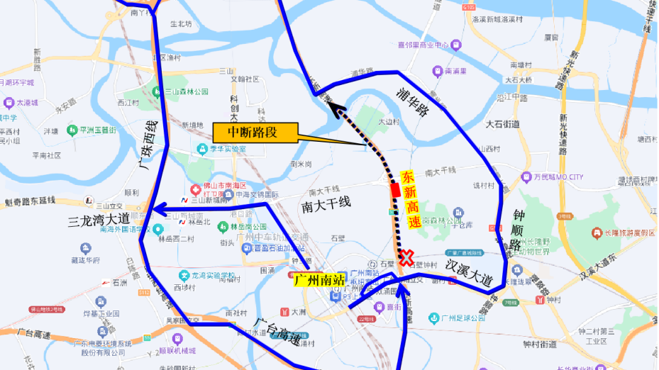 【南大干线东新高速立交将于6月17日凌晨2点开展临时全封闭围蔽施工】广州市中心区交通项目管理中心计划于2025年6月17日凌晨2:00—2:30临时全封闭中断广州南站出口路段北向交通,实施东新高速北行K9+600交通门架标志安装。查看详情>>