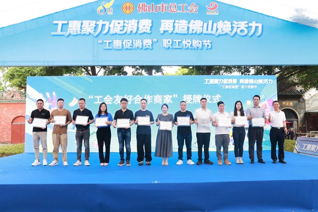悦购节启动仪式上,11家入驻企业商家代表获颁发“工惠聚力促消费 再造佛山焕活力佛山工会友好合作商家”牌匾。企业结合本次悦购节计划推出的职工专属优惠诚意满满,优惠幅度在6-9折之间。消费券领取方式详情可关注“佛山工会”微信公众号,本次“工惠促消费”活动将持续到8月31日。