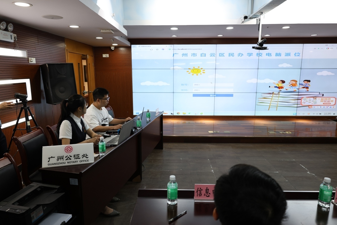白云区教育局相关负责人、白云区教育局纪检监察人员、区人大代表、区政协委员、各教育指导中心代表、校长代表、市公证处公证员代表、媒体记者、家长代表等到场全程监督见证此次电脑摇号。据介绍,为确保“公正、公平、公开”,民办小学招生摇号所使用的软件由第三方设计,本次摇号使用的电脑均由公证处提供,摇号系统在单机不联网的状态下进行。摇号程序共设计了七个环节,分别是同步系统导出原始数据、导入数据、检验数据、电脑摇号、导出数据、打印结果、签名确认。每一个环节都透明公开,监督代表们全程参与,其中部分环节由监督代表们亲自操作。