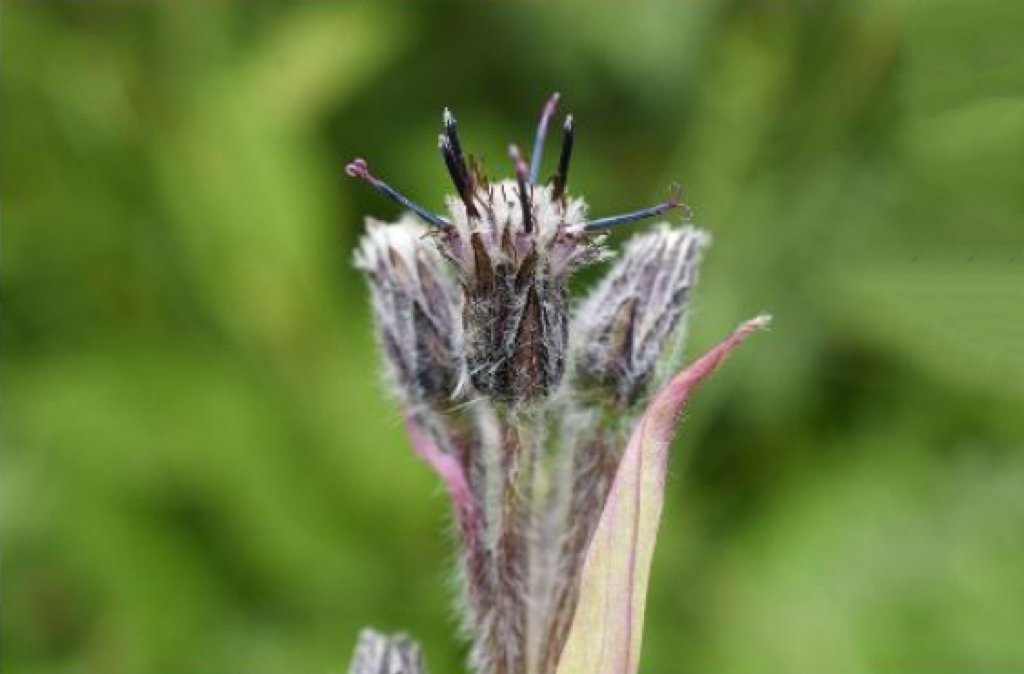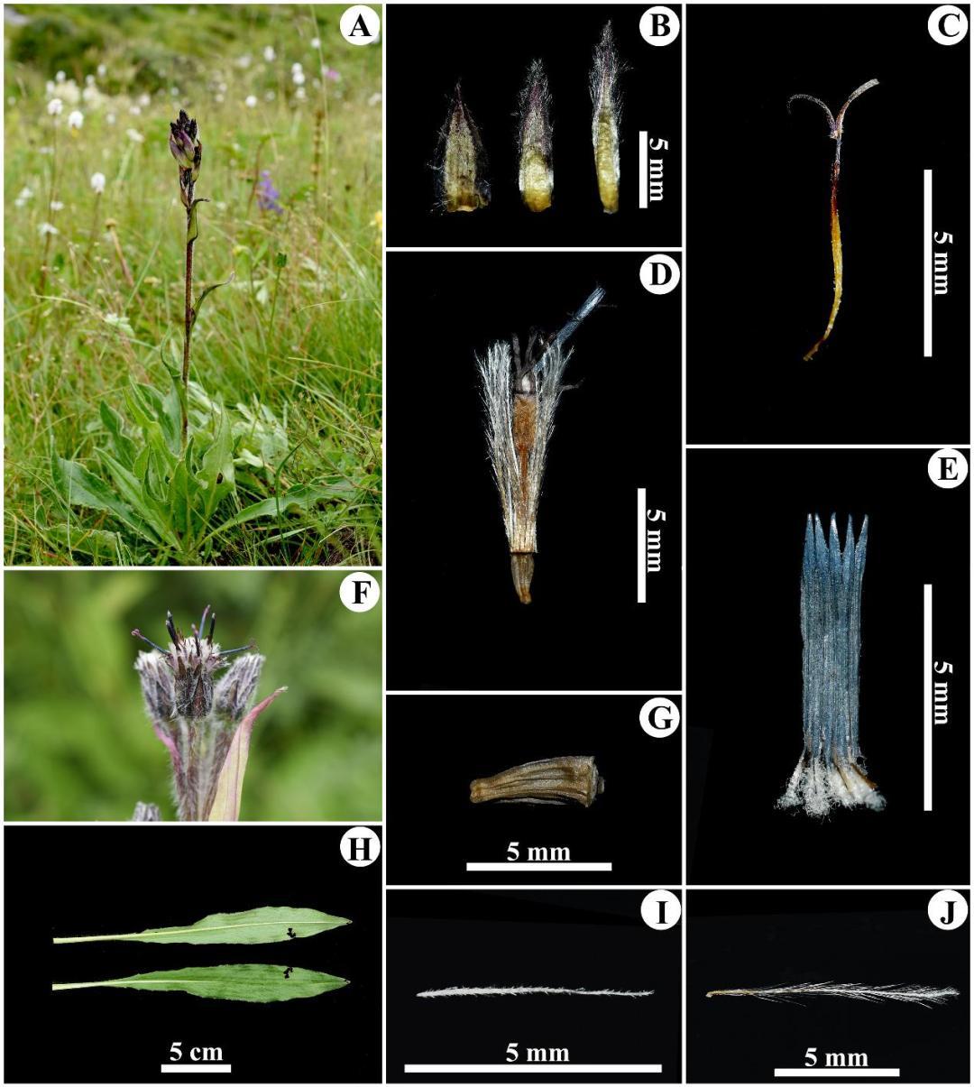 该新种因其明显的紫色苞叶、总苞片顶端无特殊颜色和单生花序,被归入风毛菊属的雪莲亚属。分子系统学分析进一步表明,该新种与尖苞风毛菊、钝苞风毛菊、横断山毛菊、打箭风毛菊、华中雪莲及文成风毛菊亲缘关系最近。在形态上,新种与钝苞雪莲相似(均具明显紫色苞叶),但其区别特征在于:叶片更大且边缘波状皱褶、苞片数量更多、总苞片顶端非钝形。