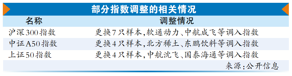 A股多个指数将迎来成分股的重要调整。根据中证指数公司、上交所等发布的公告称,将调整沪深300、中证A50、上证50等指数样本,本次调整为指数样本的定期例行调整,将于6月13日收市后正式生效。