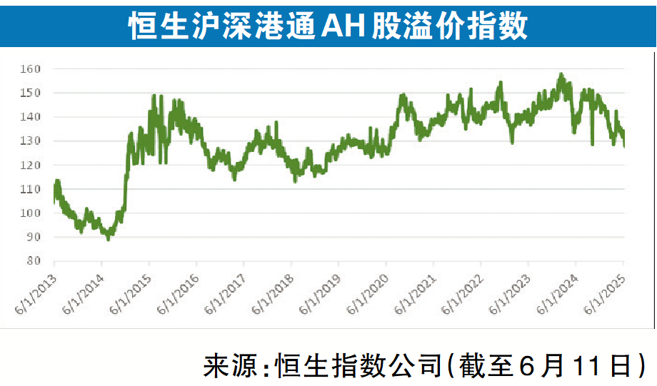 截至6月11日,恒生沪深港通AH股H指数年初至今上升17%,恒生沪深港通AH股A指数则只录得2.8%升幅。据统计,恒生沪深港通AH股溢价指数自2014年第四季度显著上升以来,绝大部分时间在120至150点之间徘徊,过去10年平均水平为134.43点。