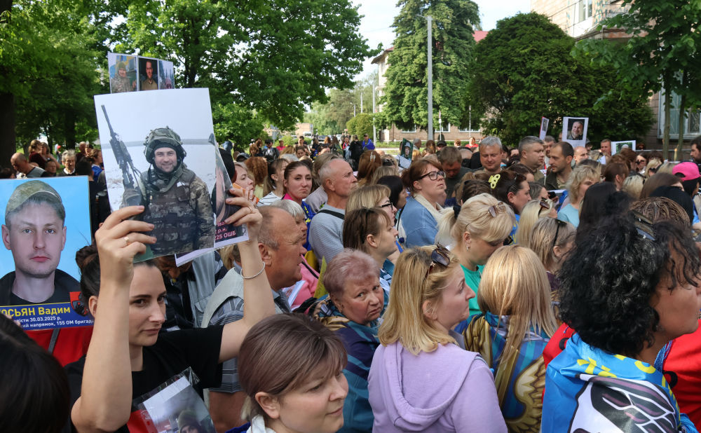 图为5月23日,乌克兰民众举着失踪军人的照片寻求帮助。新华社发(彼得·德鲁克摄)