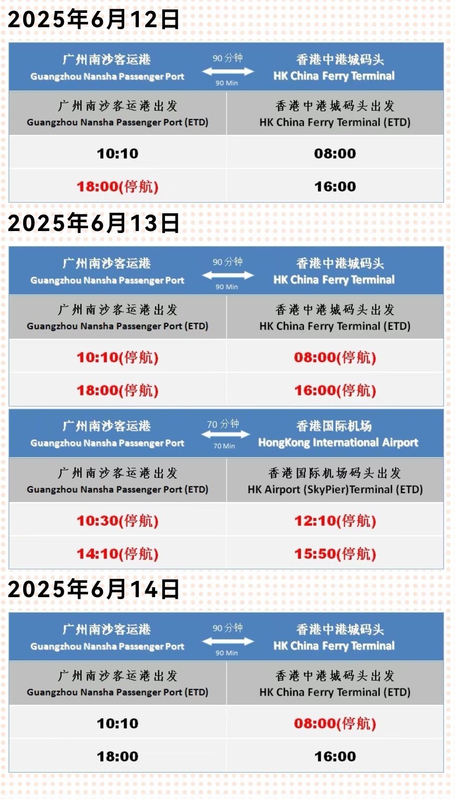 今年第1号台风“蝴蝶”已于6月12日晚上加强为强热带风暴级,受其影响,6月12日至6月14日南沙客运港往返香港中港城、香港国际机场部分航班暂停营运,其中,6月13日航班全部暂停营运。广州海事部门已于6月12日16时15分启动防热带气旋IV级应急响应,全力做好台风防御工作。