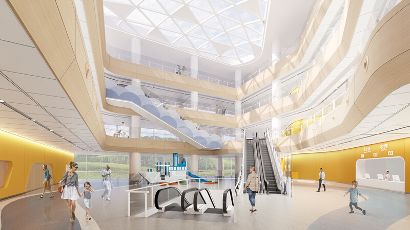 同时,医院内部空间也充分考虑到儿童的生理和心理特点,大厅整体色调从橙色过渡到蓝色,大厅中央设置活动区,大厅与医疗街均设置不同功能的互动墙体,增加趣味空间,旨在缓解儿童患者在就医过程中可能产生的紧张情绪。