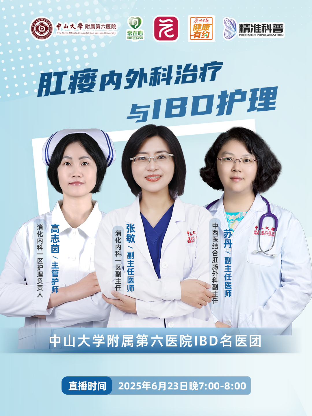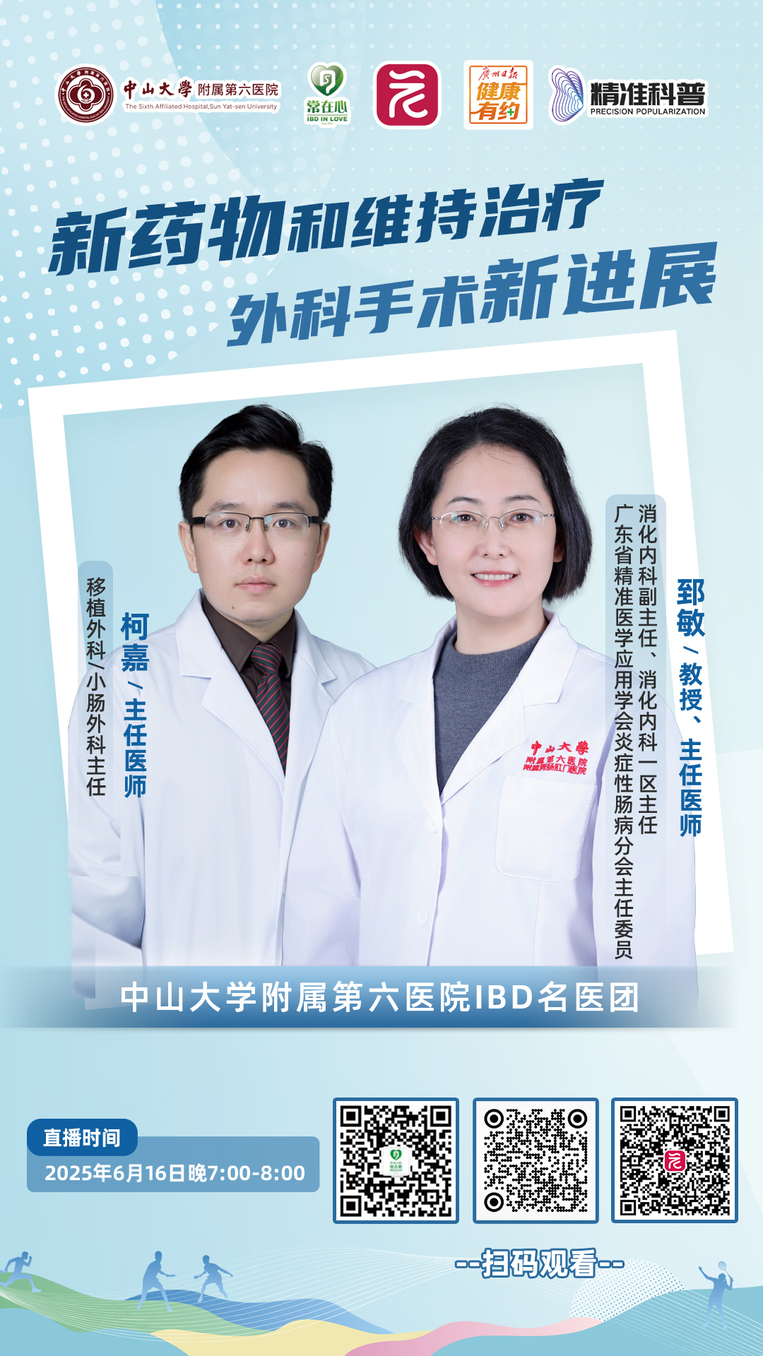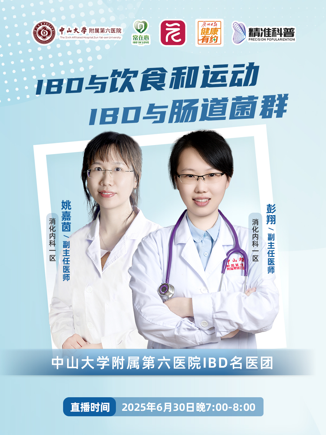 为了让大众更了解IBD,也为患者和家属带来专业科普,广州日报健康有约联合广东省精准医学应用学会、中山大学附属第六医院IBD名医团和炎症性肠病志愿团队“常在心”,连续第5年推出“名医大讲堂微课”,为大家解惑答疑。6月16日起,我们连续三周“周一见”,晚7点到8点,请感兴趣的朋友锁定直播间!