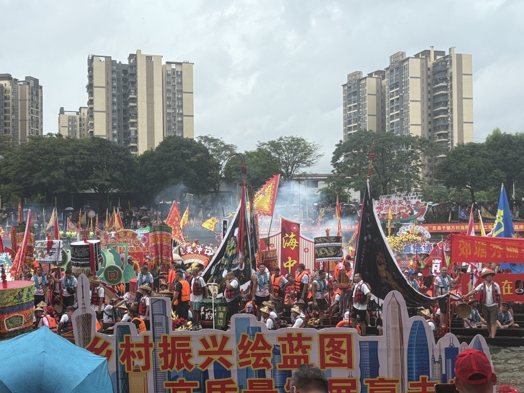授旗仪式后,细雨之中,龙舟巡游正式开始。21条龙船整装待发,它们被精心装饰,围绕 “乡村振兴”“舌尖荔湾”“非遗传承”“高质量发展” 四大主题争相竞艳。荔湾美食、岭南花卉、城中村改造、产业载体……每条龙船如移动的展台,承载着浓厚的地域特色,讲述着荔湾各村社践行“百千万工程”的风采。