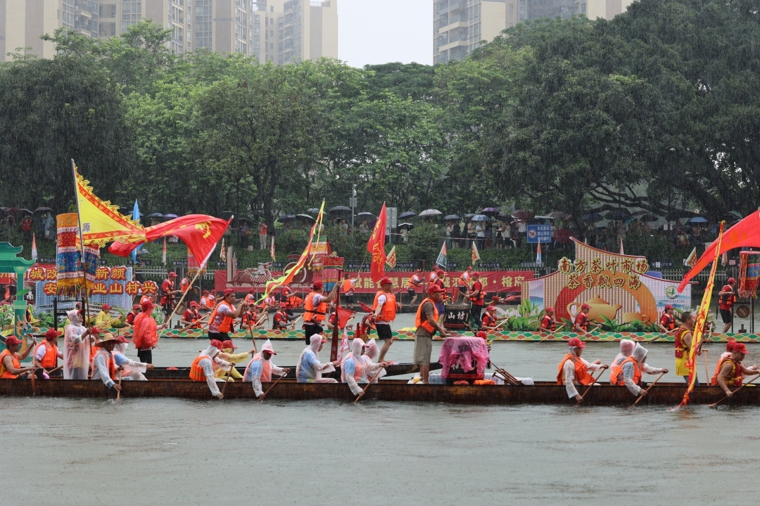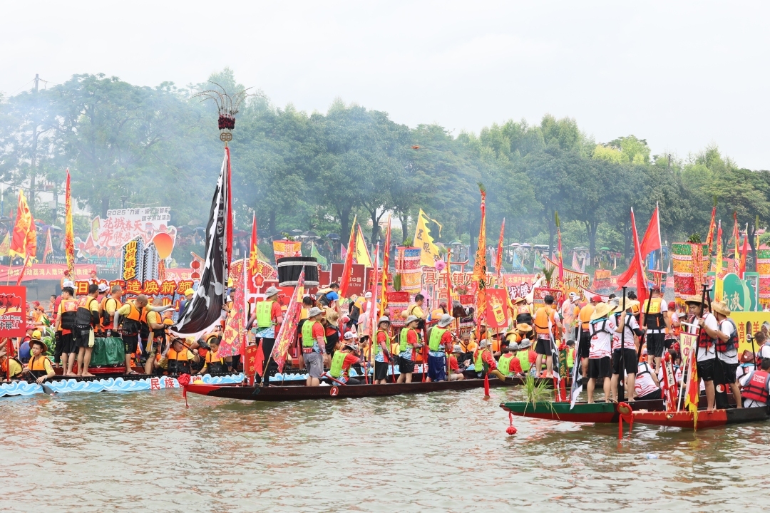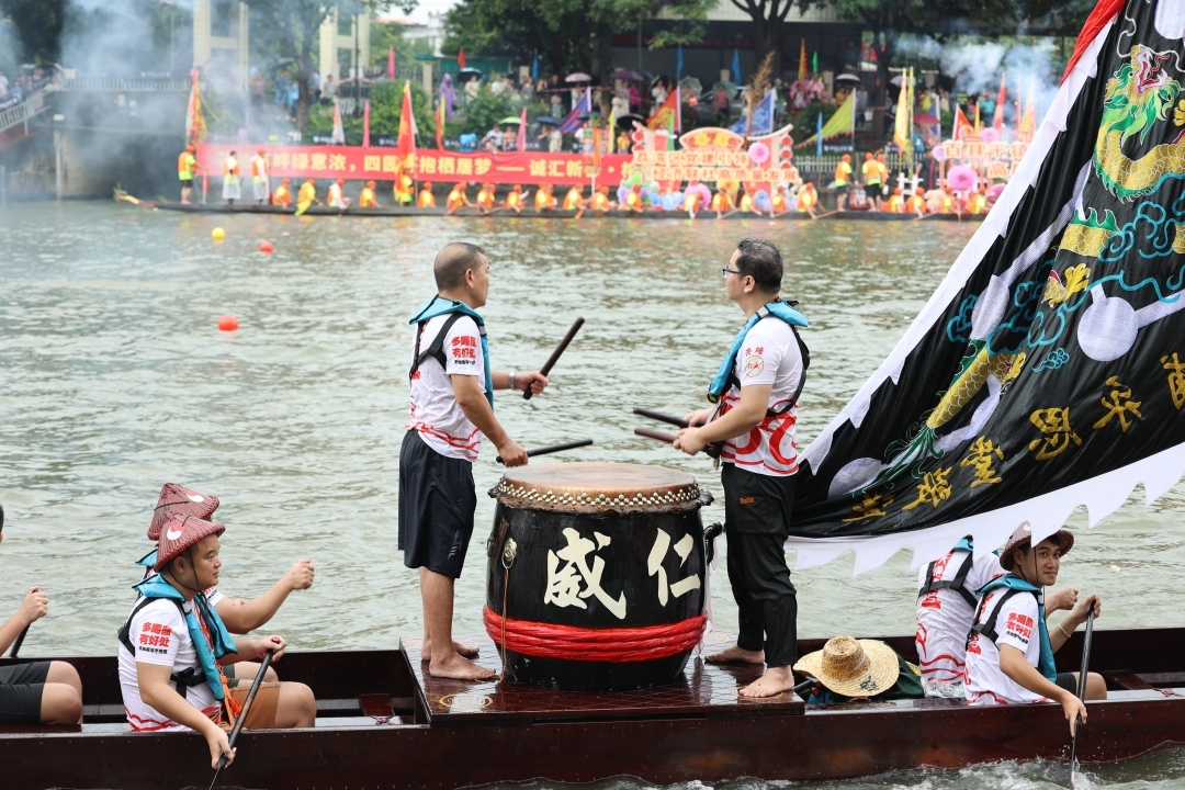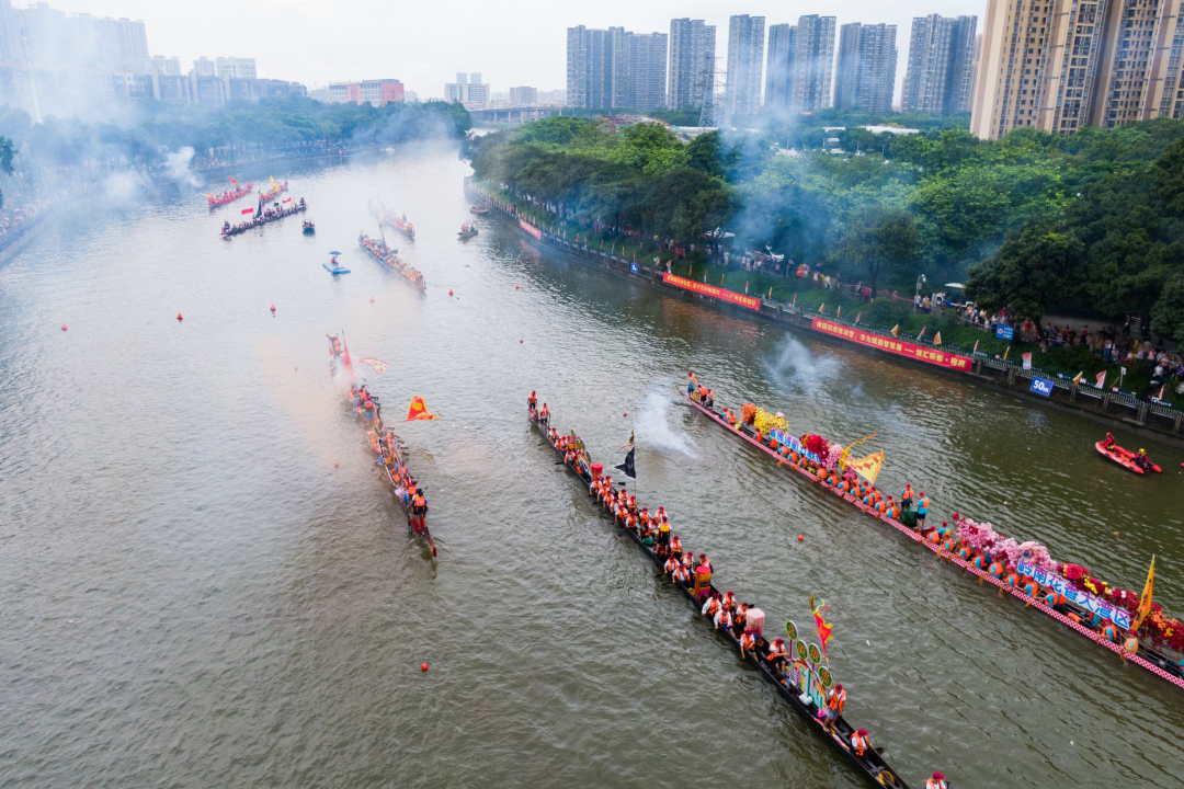 旧时荔湾商业兴盛,沿花地河至荔枝湾一带商船往来频繁,各地商贾云集,每年端午前后,龙船盛景也曾在花地河接连上映,成为当时宗族村社联系情谊、共谋发展的见证。今年是恢复花地河游龙活动的第二年,游龙阵容堪称“顶配”,备受瞩目的冲口墩头老龙、与南海盐步老龙结契的“契仔”泮塘凸眼龙,以及茶滘、坑口、南漖等传统龙舟队悉数登场。更有“力诚号”龙船、海中女子龙舟队以及荔湾消防·海龙围龙舟队首次亮相,为这场传统活动增添了亮色。