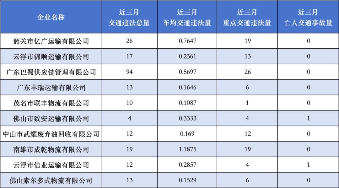 泄漏、燃烧、爆炸……由于危化品运输的特殊性和高危性,运输危险货物过程中如果发生事故,极易对周围的车辆、人员和环境造成严重后果。记者从广东交警获悉,目前已进入夏季,广东公路客运、货物运输频繁集中,客货运输交通安全风险增加,为切实加强危化品运输车辆交通安全管理,防范和减少事故发生,督促相关运输单位落实安全生产主体责任,根据今年省“安全生产月”活动有关工作要求,广东省公安厅交通管理局对近3月(2025年2月至4月)交通违法量较多、发生道路交通亡人事故的危化品运输企业进行曝光。