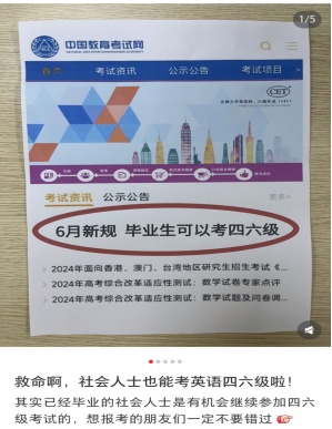 上述工作人员补充,官方从来没有公布过社会人士可以通过花钱或注册小自考来获取英语四六级报考资格的新规,也从未听过类似反馈,考生一定要以英语四六级官网为准,谨慎对待其他渠道的不实信息。