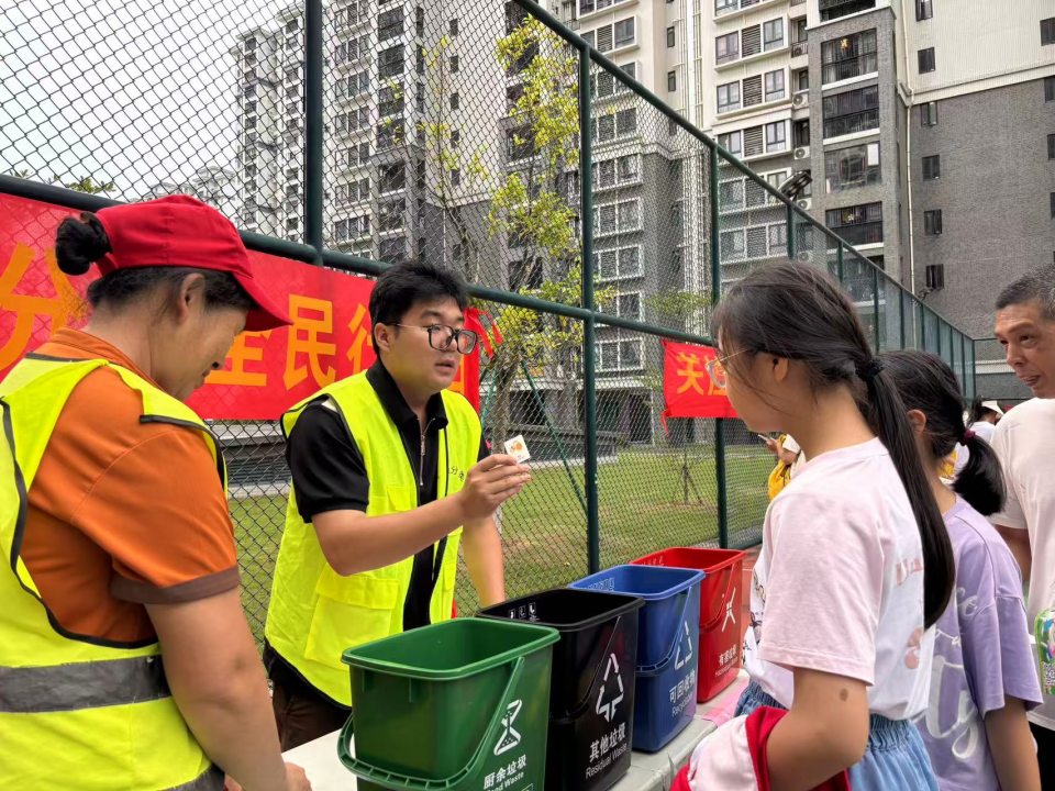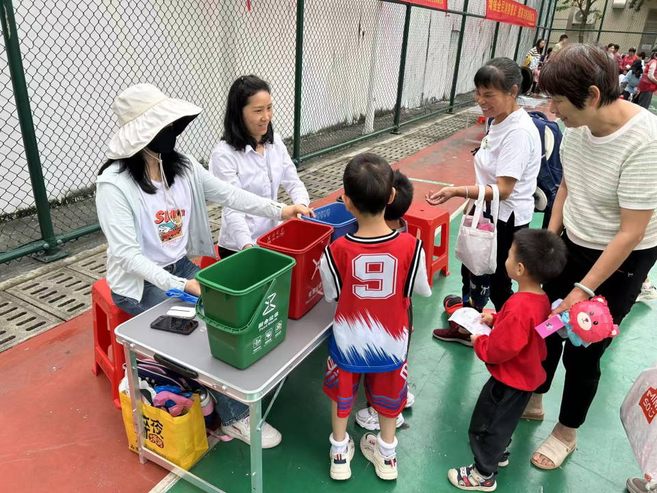 当天,九佛社区在各小区开展的垃圾分类趣味宣传同样气氛热烈,色彩明亮的四色桶游戏区吸引众多家庭参与。