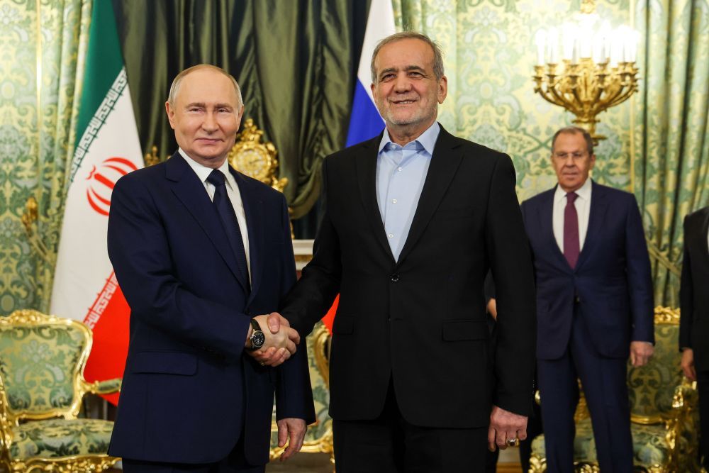 2025年1月17日,俄罗斯总统普京(左)与到访的伊朗总统佩泽希齐扬在莫斯科举行会谈。新华社/塔斯社